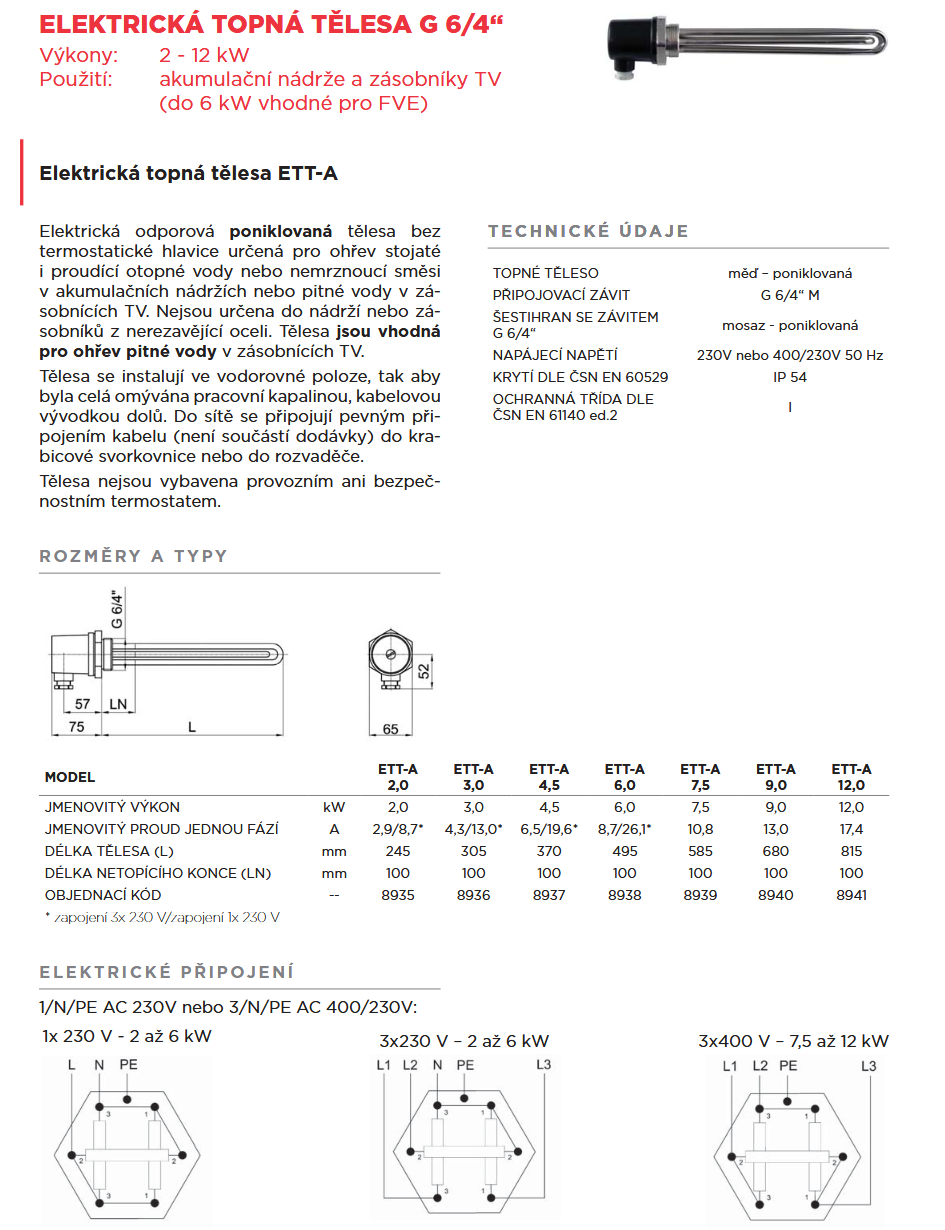 Elektrické odporové poniklované těleso bez termostatické hlavice určené pro ohřev stojaté i proudící otopné vody nebo nemrznoucí směsi v akumulačních nádržích nebo pitné vody v zásobnících TV. Do sítě se připojuje pevným připojením kabelu (není součástí dodávky) do krabicové svorkovnice nebo do rozvaděče.