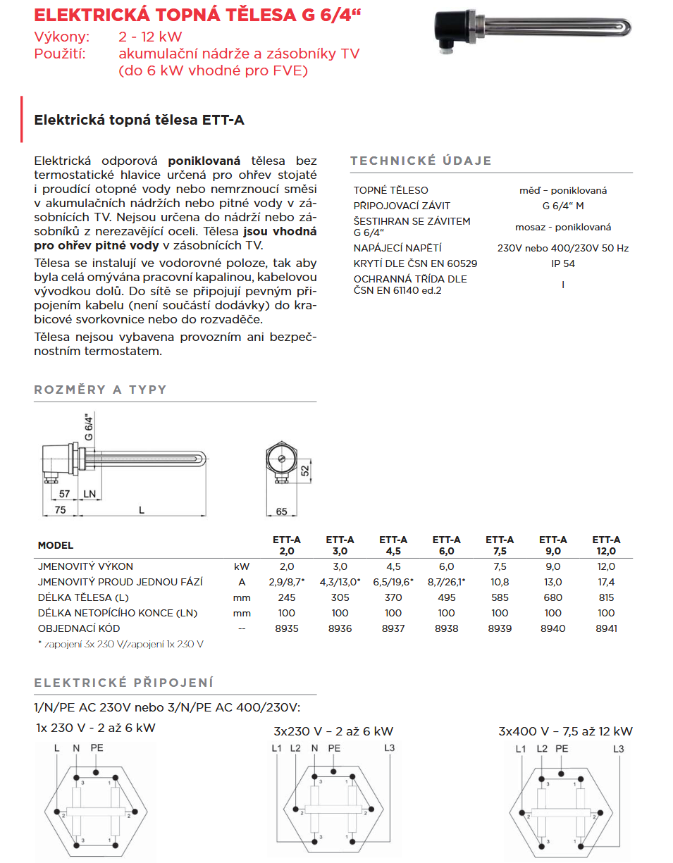 Elektrické odporové poniklované těleso bez termostatické hlavice určené pro ohřev stojaté i proudící otopné vody nebo nemrznoucí směsi v akumulačních nádržích nebo pitné vody v zásobnících TV. Do sítě se připojuje pevným připojením kabelu (není součástí dodávky) do krabicové svorkovnice nebo do rozvaděče.