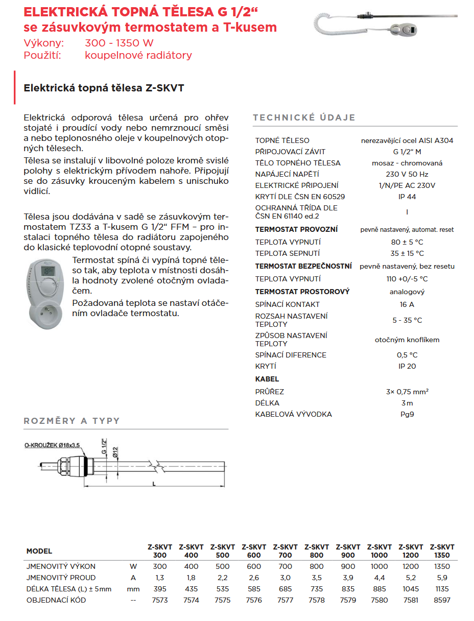 Regulus Topné těleso do radiátoru Z-SKVT s T-kusem a zásuvkovým termostatem TZ33, 1/2" M - 1350W, délka 1135mm