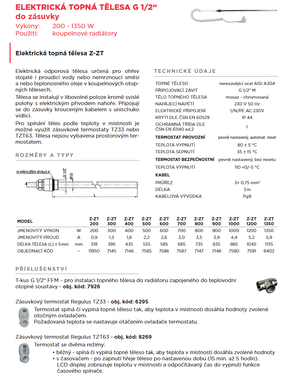 Elektrické odporové těleso do koupelnových otopných těles. Připojuje se do zásuvky krouceným kabelem s unischuko vidlicí. Těleso není vybaveno prostorovým termostatem. Pro spínání podle teploty v místnosti je možné využít zásuvkové termostaty TZ33 nebo TZT63.