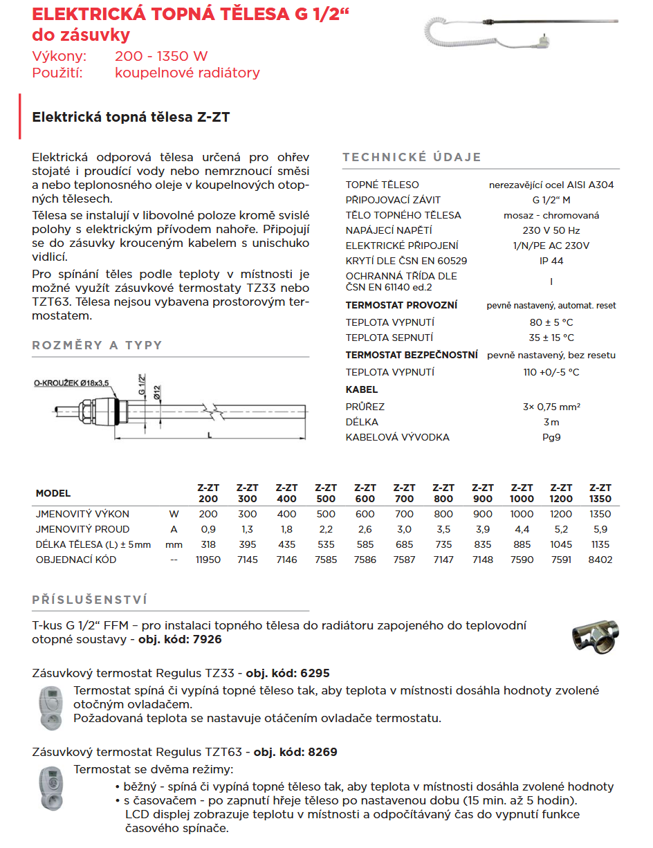Elektrické odporové těleso do koupelnových otopných těles. Připojuje se do zásuvky krouceným kabelem s unischuko vidlicí. Těleso není vybaveno prostorovým termostatem. Pro spínání podle teploty v místnosti je možné využít zásuvkové termostaty TZ33 nebo TZT63.