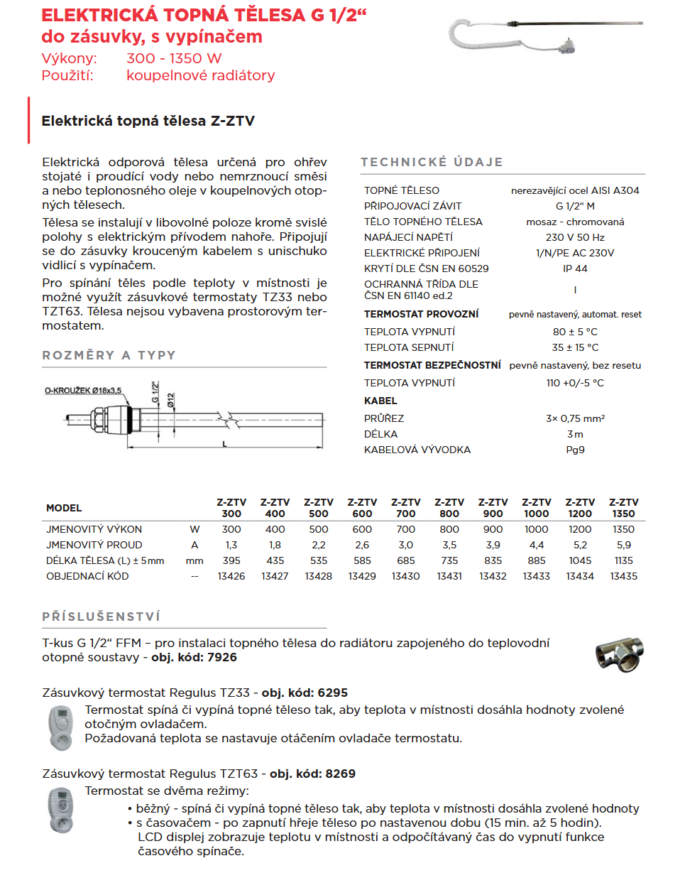 Elektrická odporová tělesa určená pro ohřev stojaté i proudící vody nebo nemrznoucí směsi a nebo teplonosného oleje v koupelnových otopných tělesech. Tělesa se instalují v libovolné poloze kromě svislé polohy s elektrickým přívodem nahoře. Připojují se do zásuvky krouceným kabelem s unischuko vidlicí s vypínačem. Pro spínání těles podle teploty v místnosti je možné využít zásuvkové termostaty TZ33 nebo TZT63. Tělesa nejsou vybavena prostorovým termostatem.