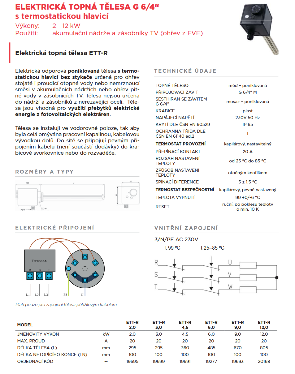 Elektrické topné těleso G 6/4" s termostatickou hlavicí 3x230V s provozním a havarijním termostatem, bez kabelu, vhodné do otopné i pitné vody, vhodné pro využití přebytků z jednofázových i třífázových fotovoltaických elektráren (zapojení do hvězdy).