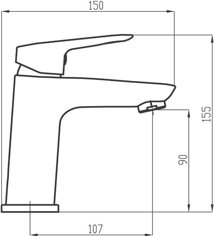 COMFORT 90 mm - umyvadlová baterie bez výpusti s celkovou výškou 155 mm a délkou výtokového ramínka 107 mm.