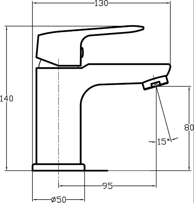 Umyvadlová baterie bez výpusti s výškou 140 mm a délkou výtokového ramínka 95 mm.