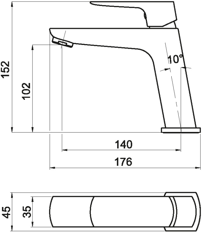 Umyvadlová baterie bez výpusti s výškou 152 mm a délkou výtokového ramínka 140 mm.