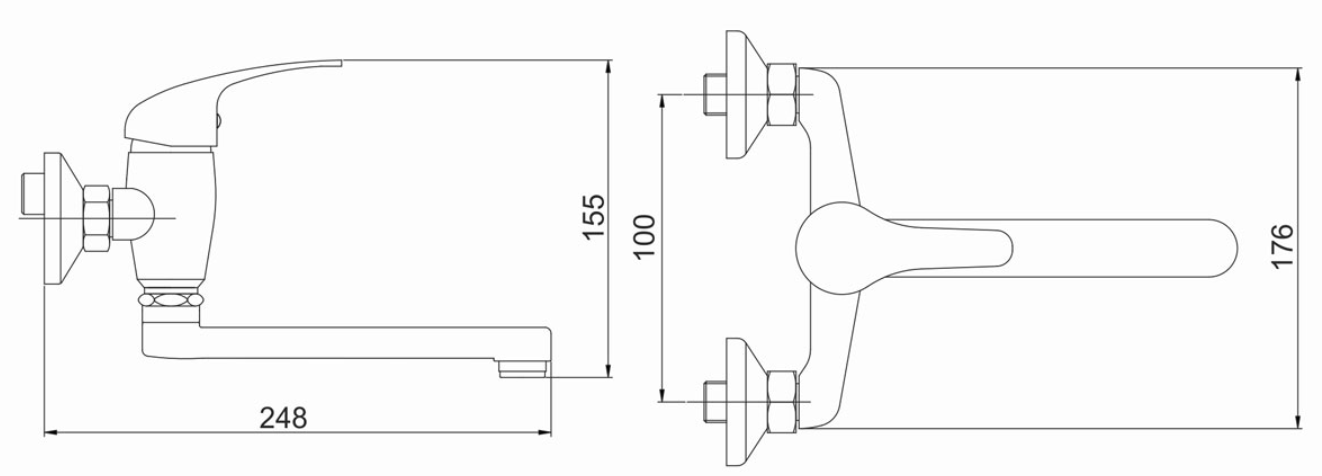 Dřezová nástěnná baterie s roztečí 100 mm a elegantním otočným ramenem o délce 200 mm.