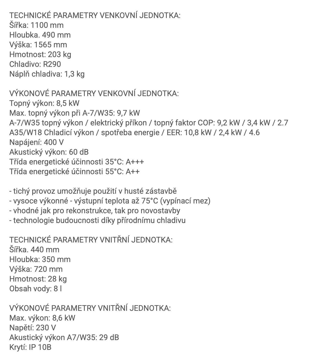 - Topný výkon/Elektrický příkon/COP pro A7/W35: 8,5/1,6/5,4