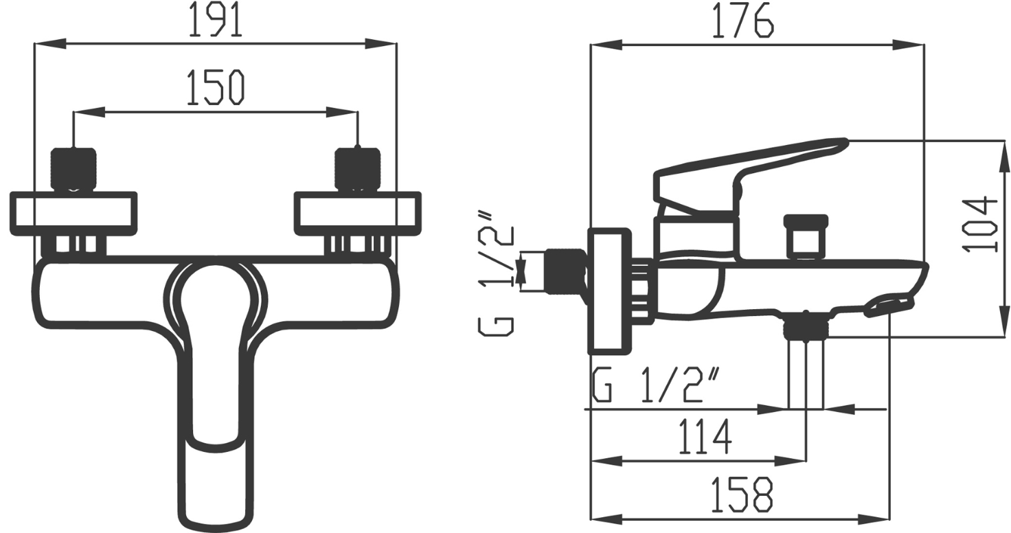 Vanová nástěnná baterie bez příslušenství s roztečí 150 mm a aretačním přepínačem sprchy.