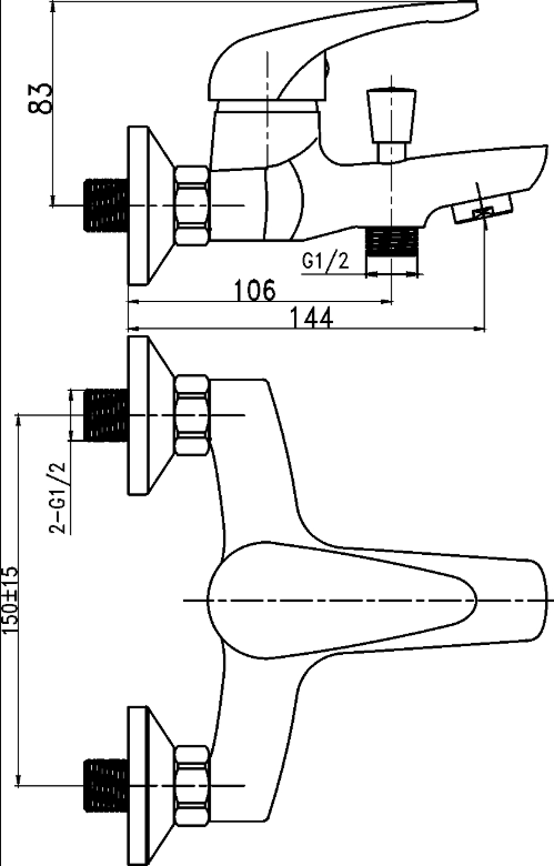 Vanová nástěnná baterie s roztečí 150 mm a kovovým aretačním přepínačem.