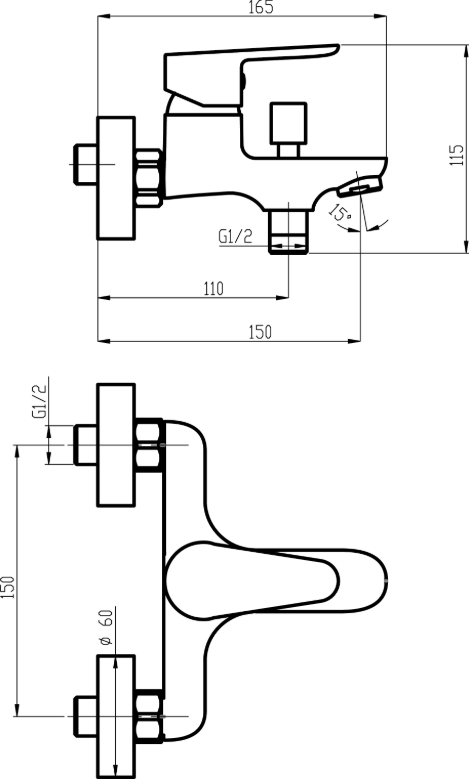 Vanová nástěnná baterie s roztečí 150 mm a kovovým aretačním přepínačem.