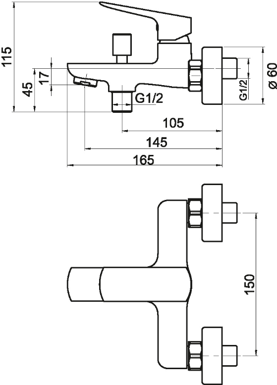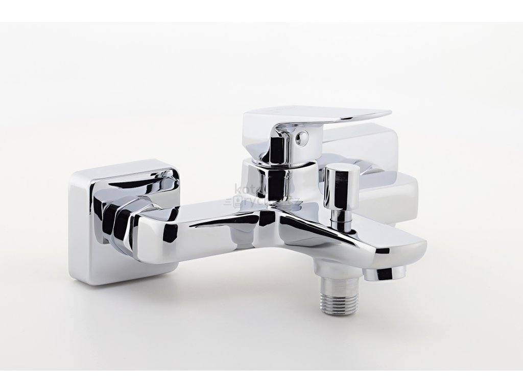 Vanová nástěnná baterie s roztečí 150 mm a kovovým aretačním přepínačem.