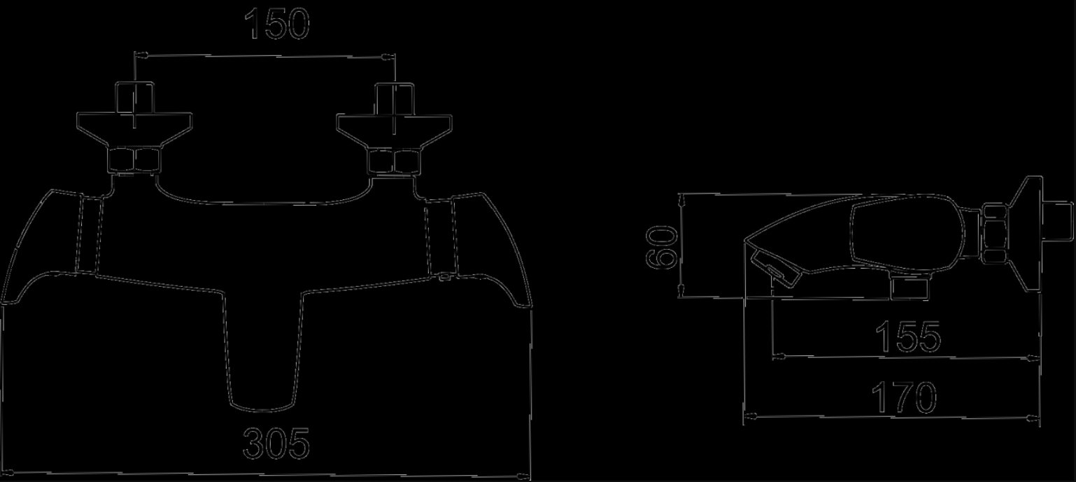 Vanová termostatická nástěnná baterie s roztečí 150 mm a přepínacím ventilem.