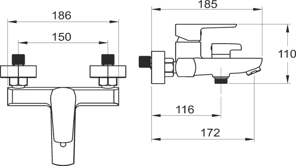 Vanová nástěnná baterie s roztečí 150 mm a šikovným keramickým přepínačem.
