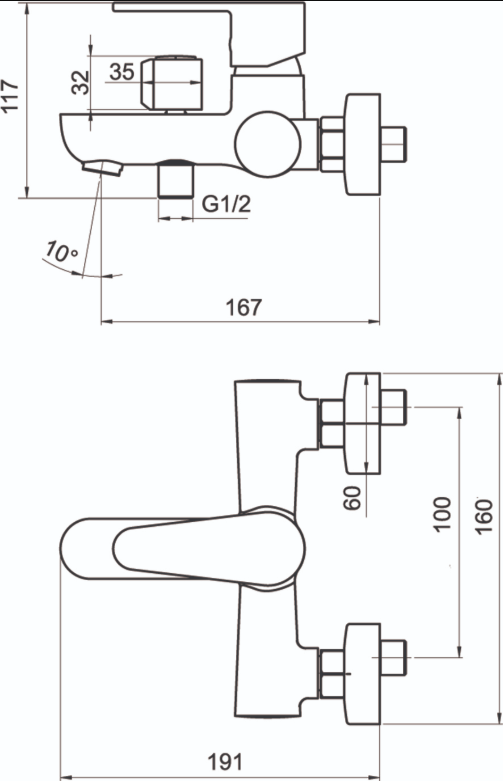 Vanová nástěnná baterie s roztečí 100 mm a kovovým aretačním přepínačem.