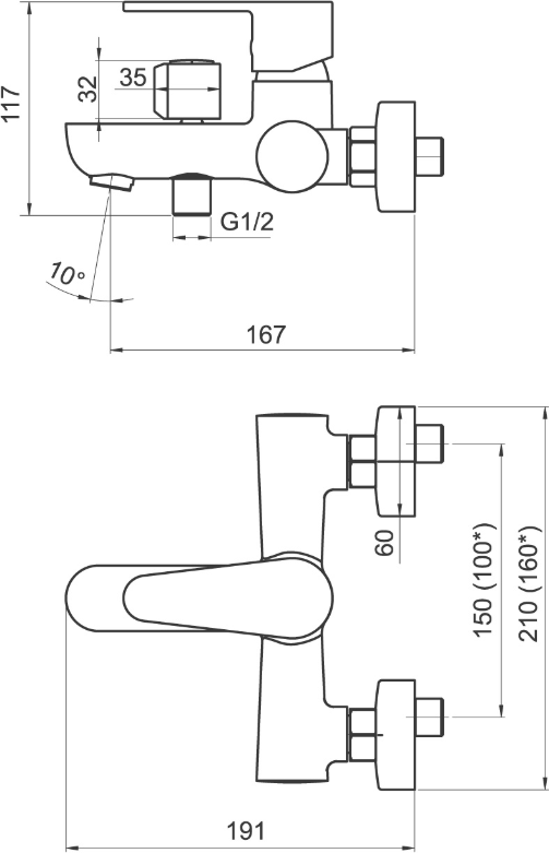 Vanová nástěnná baterie s roztečí 150 mm a šikovným keramickým přepínačem.