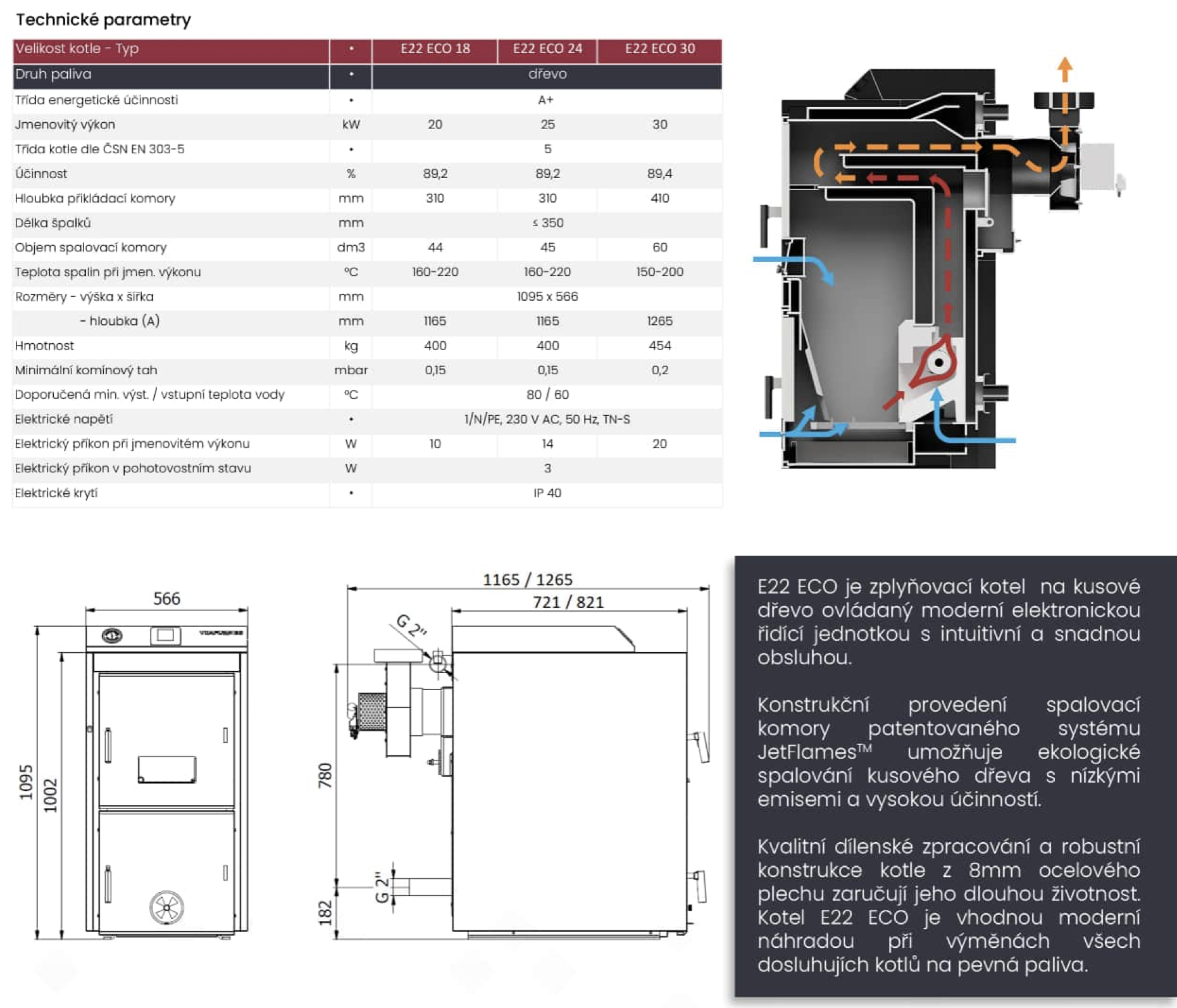 E22 ECO je nová generace úsporných zplyňovacích kotlů na palivové dřevo ovládaný moderní elektronickou řídící jednotkou s intuitivní a snadnou obsluhou, s regulovatelným výkonem v rozsahu 30-100%, bez potřeby instalace akumulační nádrže pro odvod nadbytečného tepla.