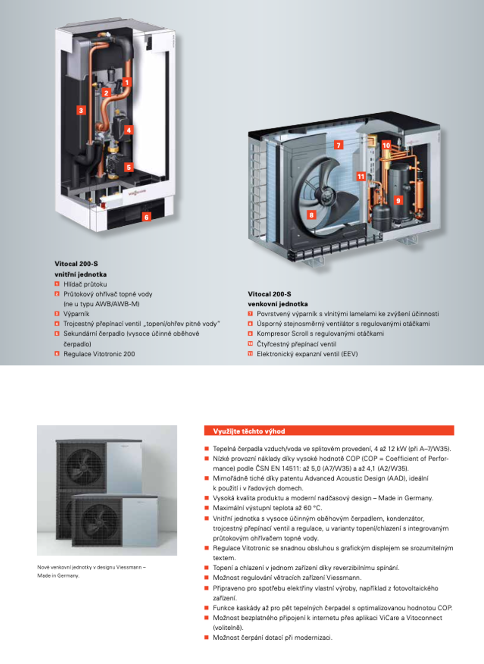 Tepelné čerpadlo vzduch/voda Vitocal 200-S ve splitovém provedení využívá ekologicky a levně teplo, které je obsaženo ve venkovním vzduchu. Dodává se volitelně pouze k topení nebo k topení a chlazení.