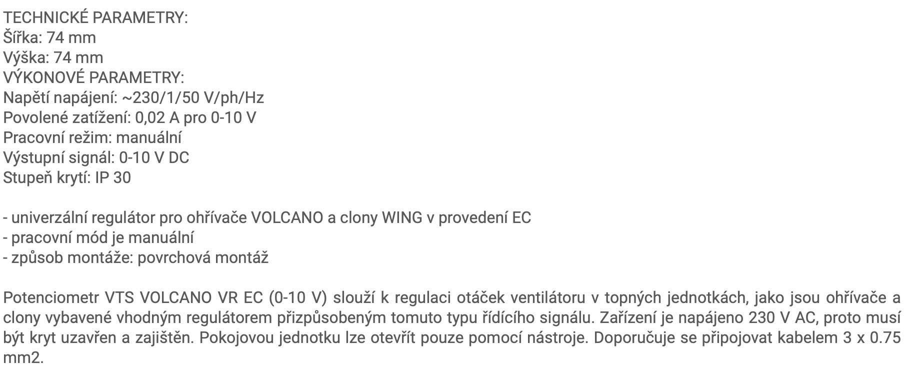 VTS VR EC potenciometr 0-10V, pro teplovzdušné jednotky VOLCANO a clony WING