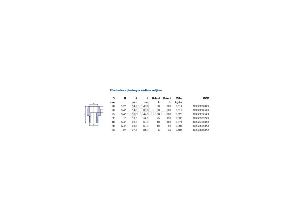 WAVIN EKOPLASTIK PPR přechodka 25x3/4", s plastovým závitem vnějším, svařovací, voda, PP-R