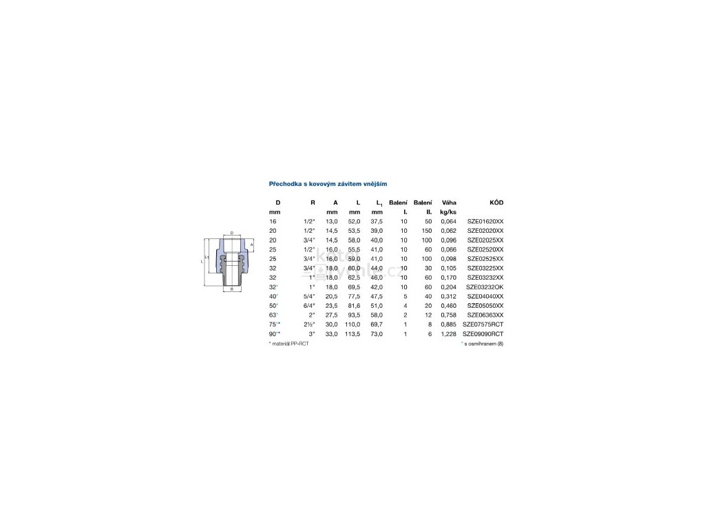 WAVIN EKOPLASTIK PPR přechodka 50mm, 6/4", s kovovým závitem vnějším a osmihranem, navařovací, voda, PP-R