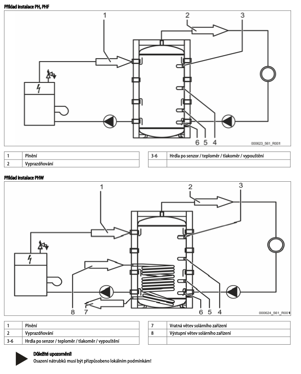 Řady připojovacích hrdel k připojení zdrojů tepla a tepelných spotřebičů jsou řazeny vertikálně, s přesazením o 100°, jako plnicí nebo vypouštěcí hrdla (nátrubky). Mezi těmito řadami připojovacích hrdel jsou také k dispozici různé možnosti k zašroubování senzorových jímek, teploměrů aj. (3 x Rp 3/4, 1 x Rp 1/2).