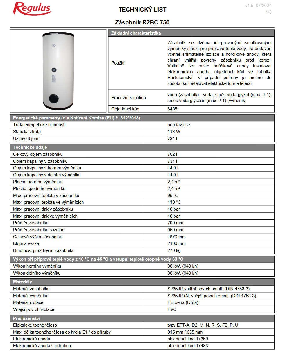 Zásobníkový ohřívač s 2 topnými hady, smaltovaný, s možností instalovat el. topné těleso, a s možností dalšího el. topného tělesa nebo žebrovaného výměníku tepla do příruby bočního kontrolního otvoru, pr. 950 mm, výška 1870 mm; zásobník je dodáván s tvrzenou snímatelnou polyuretanovou izolací tloušťky 75 mm s bílým koženkovým povrchem