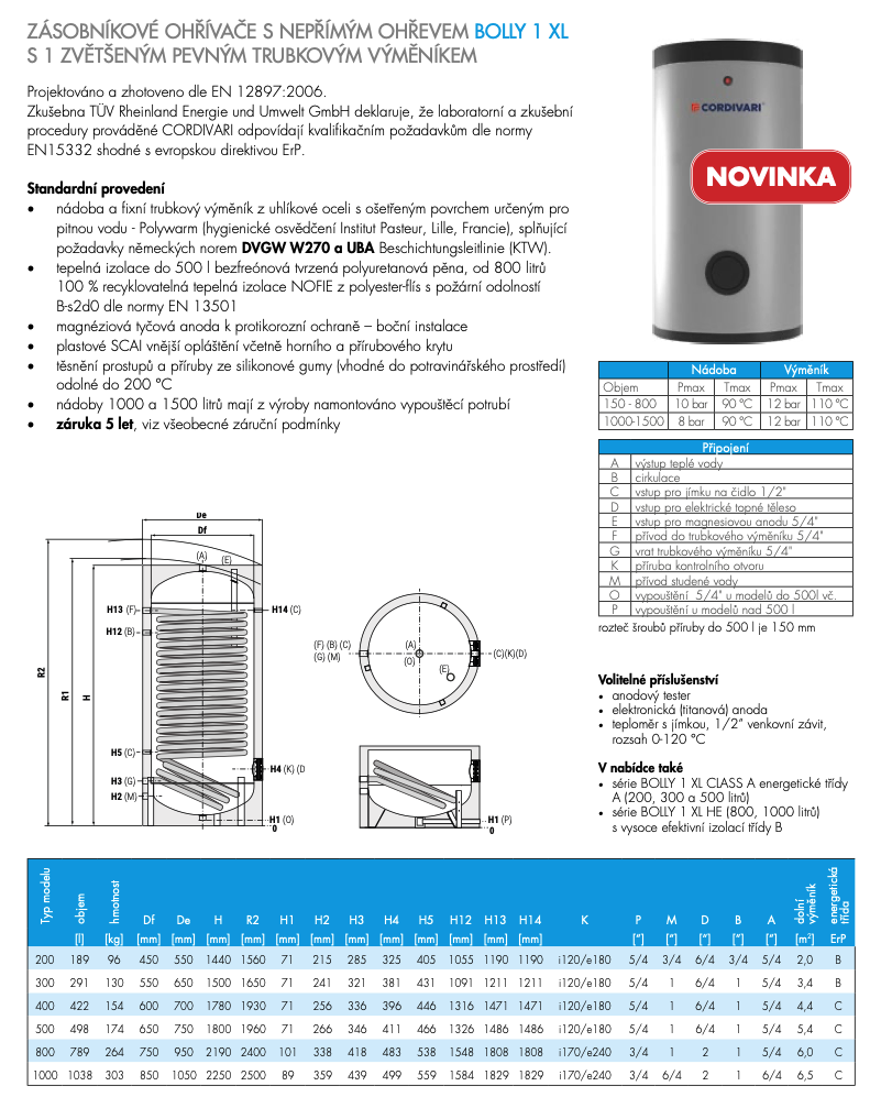 ZÁSOBNÍKOVÝ OHŘÍVAČ S NEPŘÍMÝM OHŘEVEM BOLLY 1 XL 200 l S 1 ZVĚTŠENÝM PEVNÝM TRUBKOVÝM VÝMĚNÍKEM