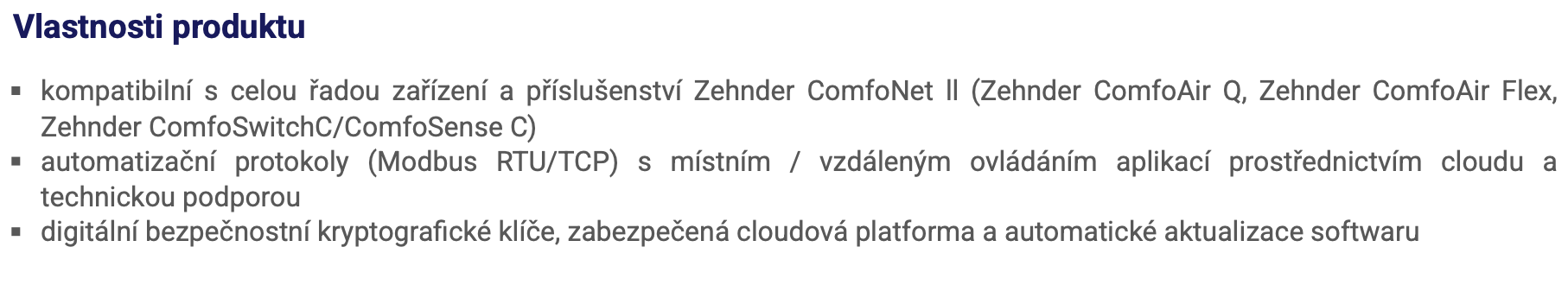 ZEHNDER COMFOCONNECT PRO rozhraní